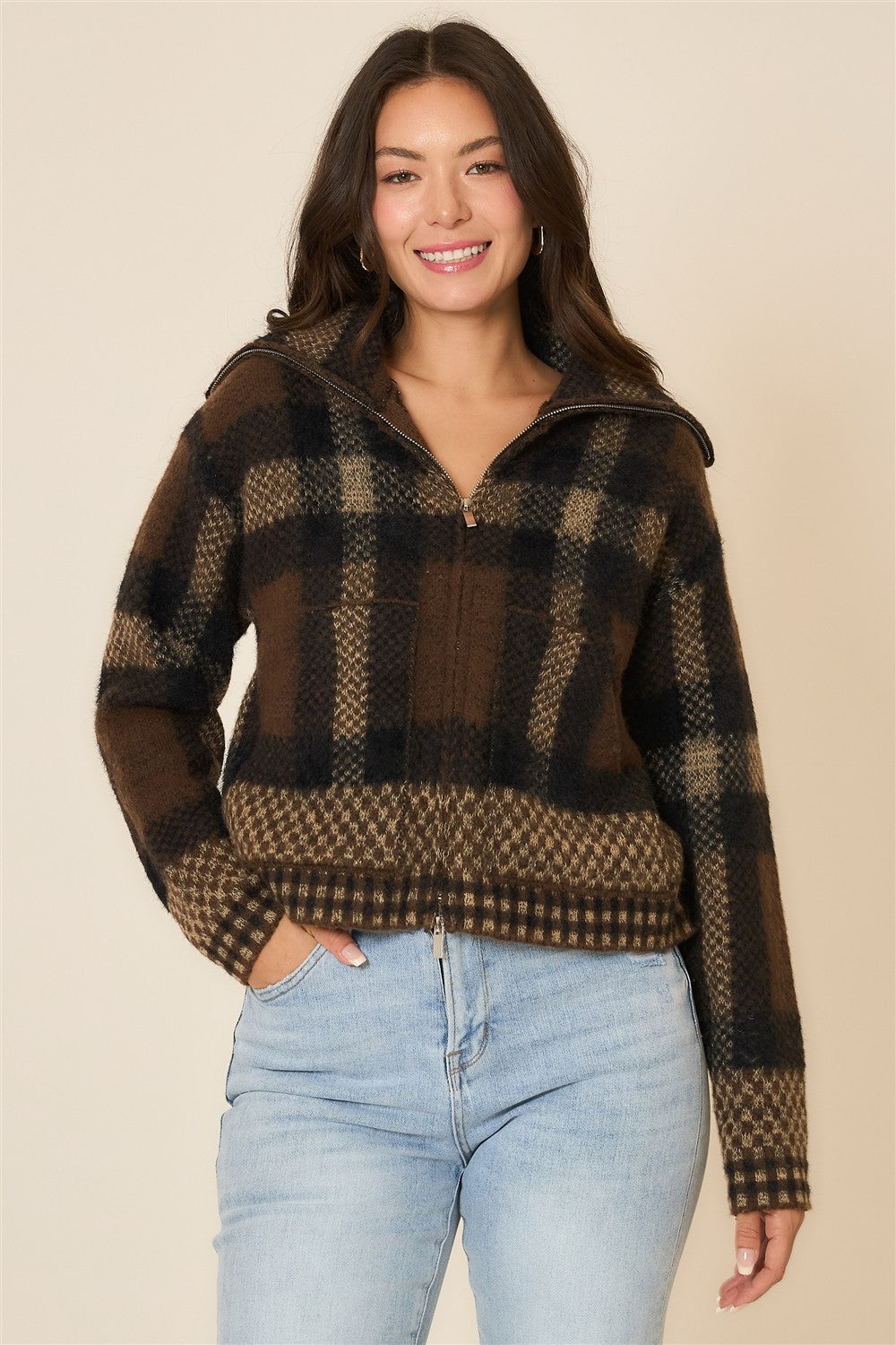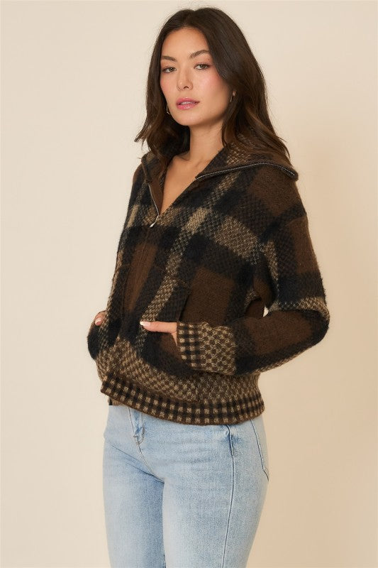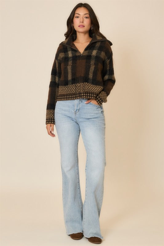 Plaid knit zip up jacket with high neck collar