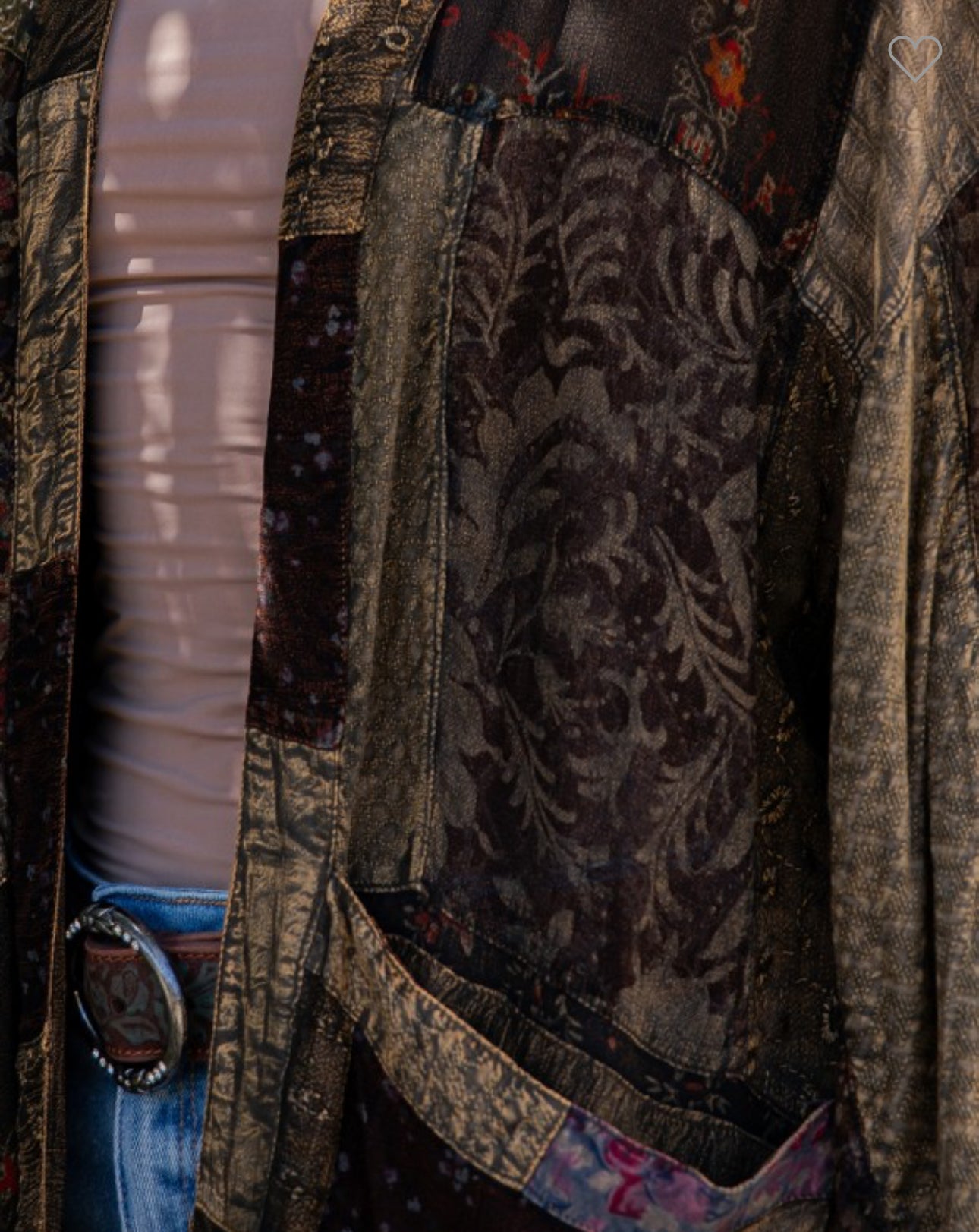 Discover the Western Patchwork Kimono Top from Young Threads — a unique mix of overdyed georgette patches with a relaxed kimono silhouette. Each top is one-of-a-kind.